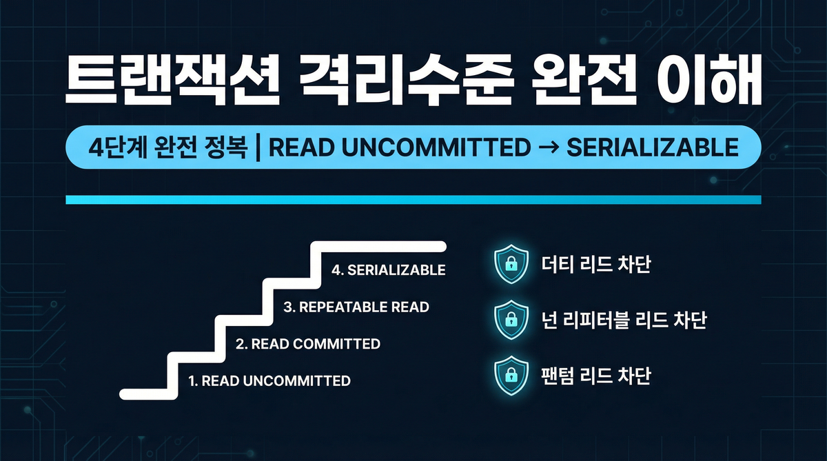 트랜잭션 격리 레벨은 올라갈수록 더티 리드, 넌 리피터블 리드, 팬텀 리드를 순서대로 차단합니다. 면접에서 이 흐름과 실무 선택 기준을 함께 설명하면 깊이 있는 답변이 될 수 있습니다. Oracle이 READ COMMITTED를, MySQL이 REPEATABLE READ를 기본값으로 선택한 이유는 각 DBMS의 MVCC 구현 방식의 차이에 있으며, 이를 이해하면 데이터베이스 동시성 제어가 더 명확해질 겁니다.