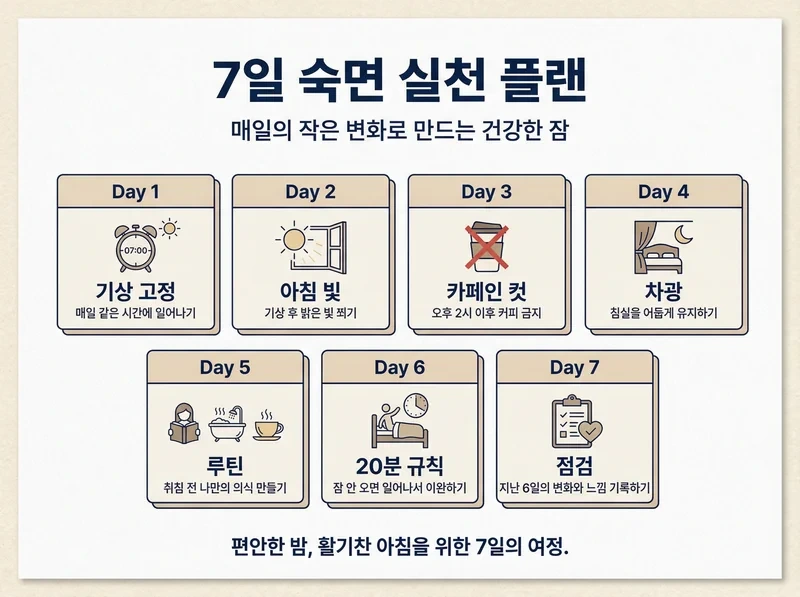 수면의 질 높이는 법은 한 번에 완벽히 바꾸기 어렵습니다. 대신 7일 동안 하루 1개만 바꾸는 방식으로 “일관성”을 만들면 지속하기 쉬워요.