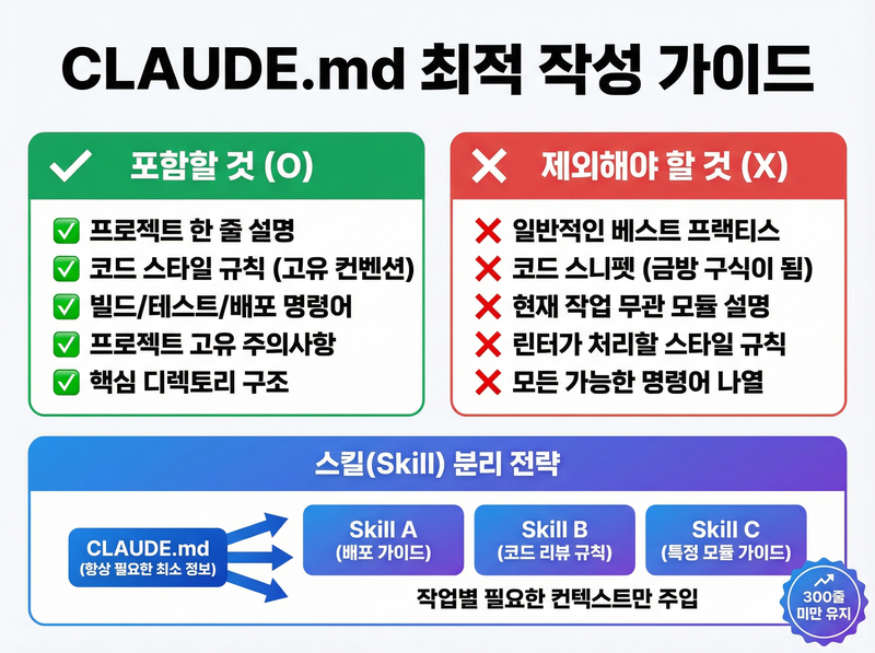 - 300줄 미만 유지: 초과하면 즉시 검토하고 불필요한 내용 삭제