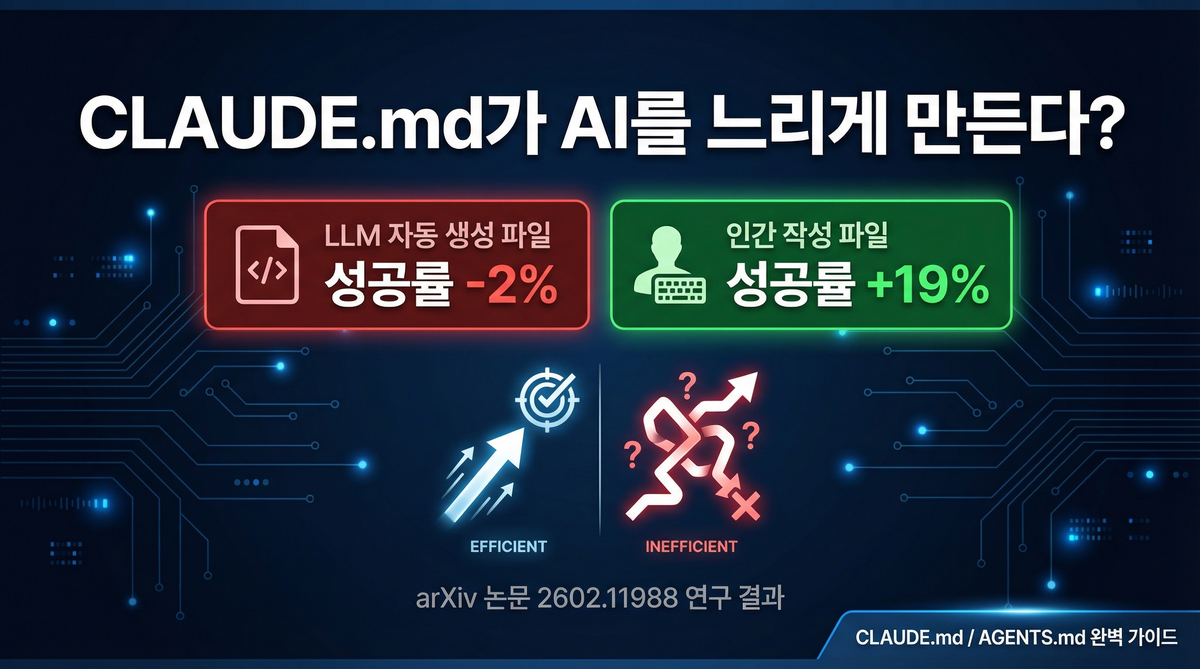 AI 코딩 에이전트 성능을 높이려고 CLAUDE.md를 꼼꼼하게 채워두셨나요? 사실 그 파일이 오히려 에이전트를 느리고 비효율적으로 만들고 있을 수 있습니다. 2026년 2월 arXiv에 게재된 논문 "Evaluating AGENTS.md: Are Repository-Level Context Files Helpful for Coding Agents?"(논문 번호 2602.11988)가 이를 데이터로 증명했는데, LLM이 자동 생성한 컨텍스트 파일은 작업 성공률을 떨어뜨리고 비용을 20% 이상 끌어올린다는 결과가 나왔습니다. 다만 인간이 직접 최소한의 정보만 담아 작성한 컨텍스트 파일은 성공률을 평균 약 19% 향상시킨다는 것도 함께 확인됐습니다. 어떻게 쓰느냐가 전부인 셈입니다.