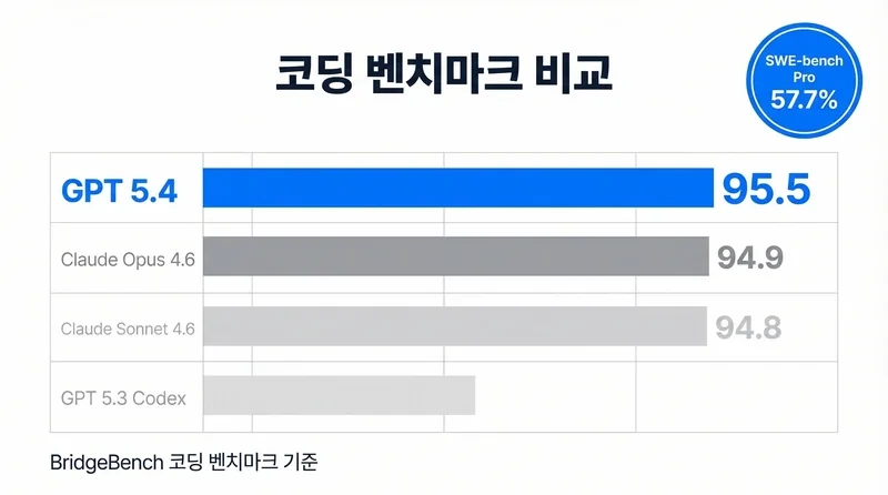 | GPT-5.4 | Computer Use, 수학, 코딩 | BridgeBench 1위, 1M 토큰 |