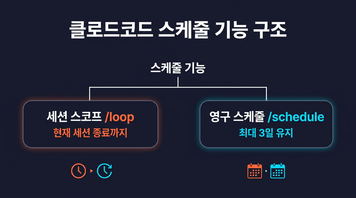 이번에 추가된 스케줄 기능은 크게 두 가지 방식으로 나뉩니다. Anthropic 공식 문서에 따르면, 하나는 현재 세션 안에서만 작동하는 세션 스코프, 다른 하나는 최대 3일까지 유지되는 영구 스케줄입니다.