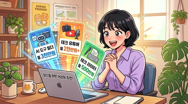 바이브코딩을 좋아하고 콘텐츠 제작에 관심이 있다는 내용으로 질문했더니 여러 직업 옵션이 카드 형태로 나왔다. AI 도구 빌더 에이전시는 월 3,000만 원 예상, 테크 유튜버는 월 2,000만 원 이상, 테크 라이터는 월 500만 원, 디벨로퍼 에드캠프 형태는 월 1,500만 원 수준이라고 표시됐다. 예측 수치이기 때문에 실제와 다를 수 있지만, 각 직업에 대한 로드맵을 버튼 하나로 바로 이어서 물어볼 수 있다는 점이 흥미롭다.