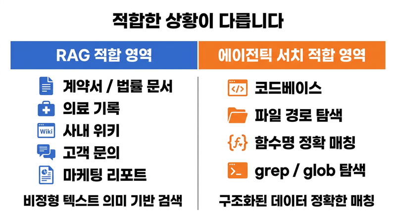Claude Code를 만든 Anthropic의 Boris Cherny가 Latent Space 팟캐스트와 해커 뉴스에서 이런 이야기를 했습니다. 초기 Claude Code에 RAG를 적용해 봤는데, 에이전틱 서치, 즉 grep이나 glob 같은 터미널 도구로 직접 탐색하는 방식이 압도적으로 성능이 좋았다는 것입니다. 코드베이스를 인덱싱해서 벡터 검색을 쓰는 대신, 모델이 직접 파일 구조를 탐색하면서 필요한 코드를 찾아가는 방식이 정확성, 보안, 신선도 측면에서 더 낫다는 판단이었습니다. 이 이야기가 퍼지면서 RAG 자체가 죽었다는 식으로 확대 해석된 것입니다.