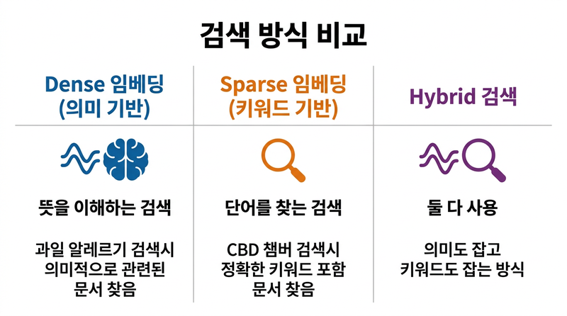 지금까지 설명한 임베딩, 즉 텍스트를 숫자 배열로 바꿔서 의미 유사도로 검색하는 방식을 Dense 임베딩(밀집 임베딩)이라고 부릅니다. 수백에서 수천 차원의 숫자가 빽빽하게 채워져 있어서 "밀도가 높다"는 뜻입니다.